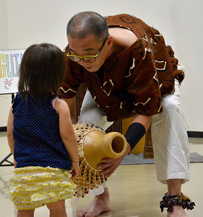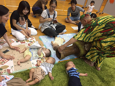 ぴんたろーの「打楽器で遊ぼ!」(写真左) 講師:ぴんたろー(古川はじめ) 対象:乳幼児親子〜大人まで 人数:親子20組くらい 時間:30分~〜60分