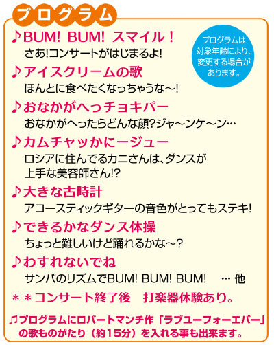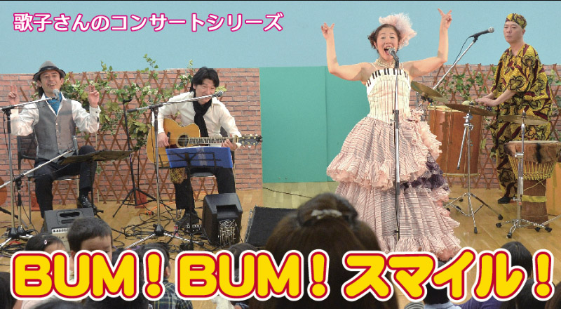 リズムに乗って体が動けば、自然と笑顔になってくる。 太鼓とBUM! BUM! 歌ってBUM! BUM! みんなで踊ってBUM! BUM! BUM! 音色の優しいアコースティックギターや珍しい世界の打楽器に触れながら、 子どもたちの自信と主体性を育ててゆきたい。そんな願いを込めて歌子が歌う、 幼児、低学年向けコンサートです。